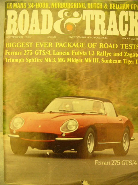 Loading... Please wait...For sale September 1967 Road and Track testing Ferrari 275 convertible it’s price was $14 400 new Sunbeam Tiger mk11 with the 289 motor comparison road test of Triumph Spitfire vs. MG Midget Lancia Fulvia and Zagato tested.WOW !!! This is a must have issue.